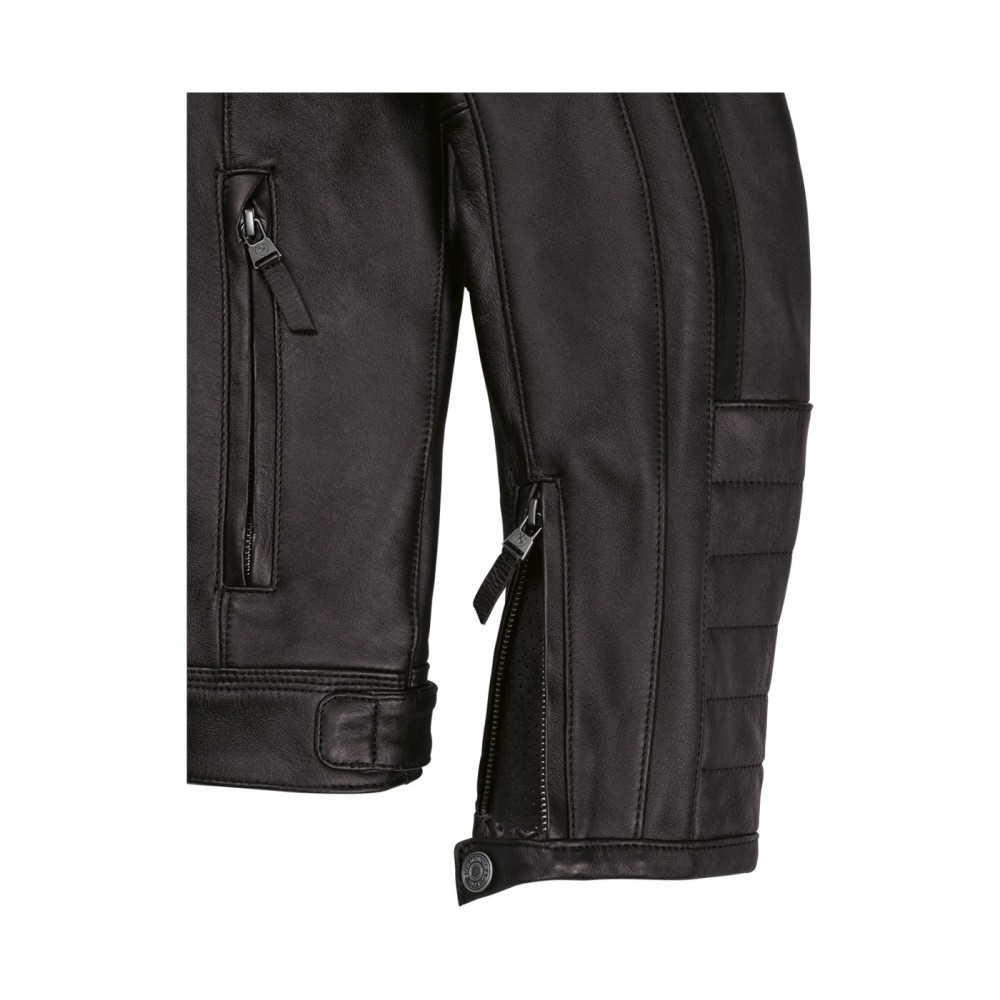 The Schwabing jacket revives a classic in a new design. Colourful stripes on the sleeves set striking visual accents. Under the high-quality cowhide, the protectors on the shoulders, elbows and back (can be retrofitted) ensure safety, while numerous pockets offer storage options. Several ventilation options offer increased comfort.