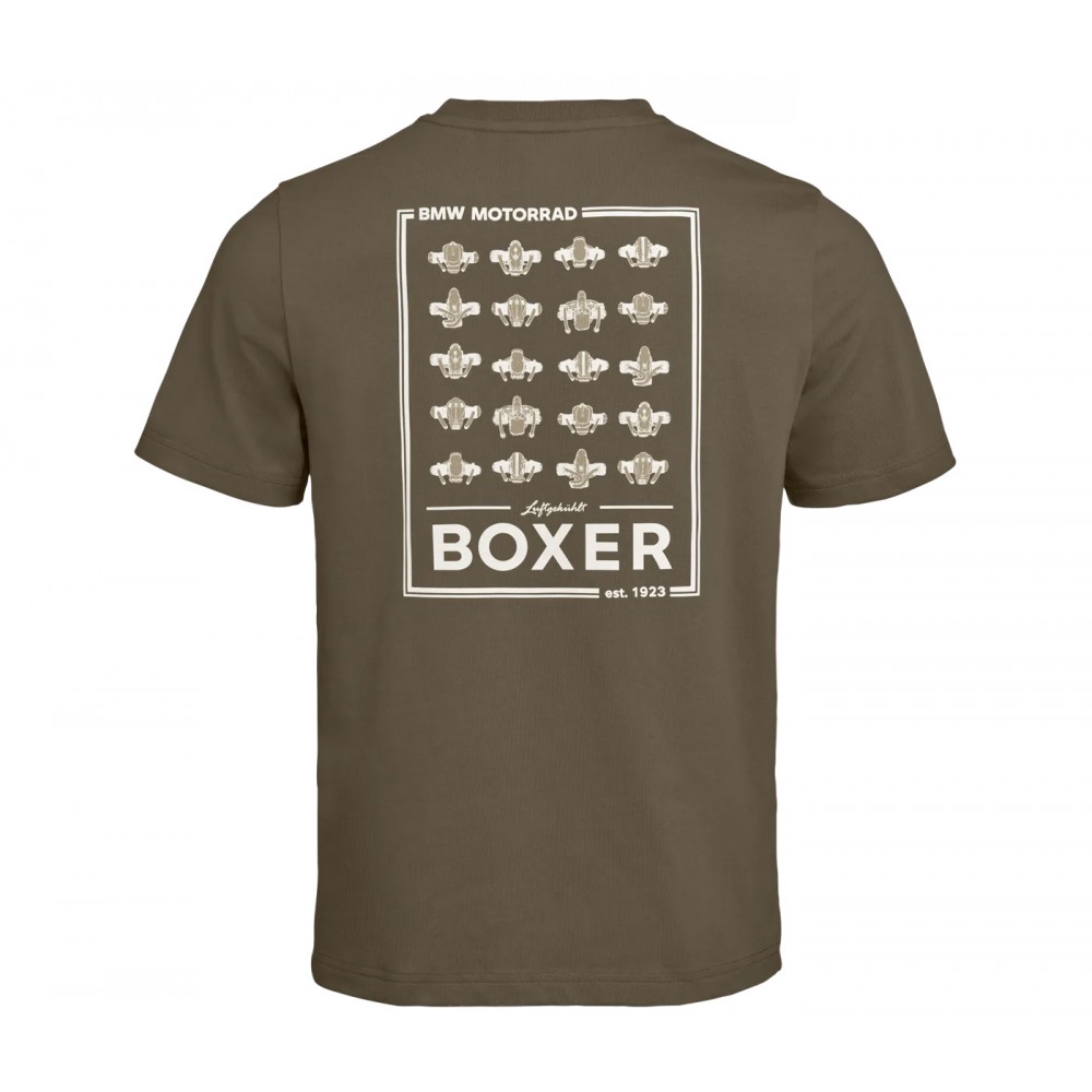 A must-have for boxer fans. The classic Aircooled round-necked T-shirt pays tribute to BMW's legendary two-cylinder engine. With two “Aircooled” prints, a boxer engine motif and an “Est. 1923” print on the khaki shirt made of particularly high-quality single jersey fabric provides an extra dose of Heritage flair.