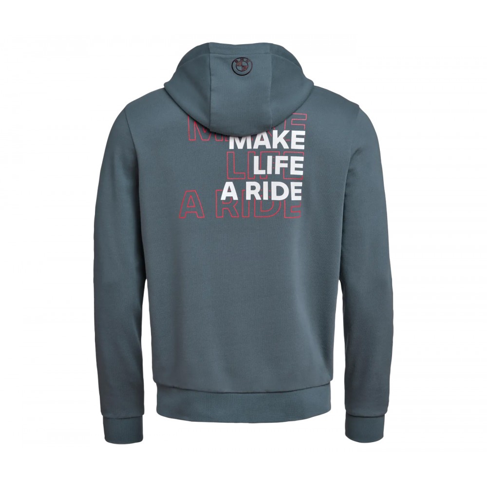 Anyone who has internalised “Make Life a Ride” as a way of life can let everyone know in a stylish way with the black and white zip hoodie of the same name. The distinctive cult slogan adorns the back of the extra-soft, black and white hooded sweatshirt as a large graphic. A subtle logo print on the left breast is the perfect nod to BMW Motorrad.