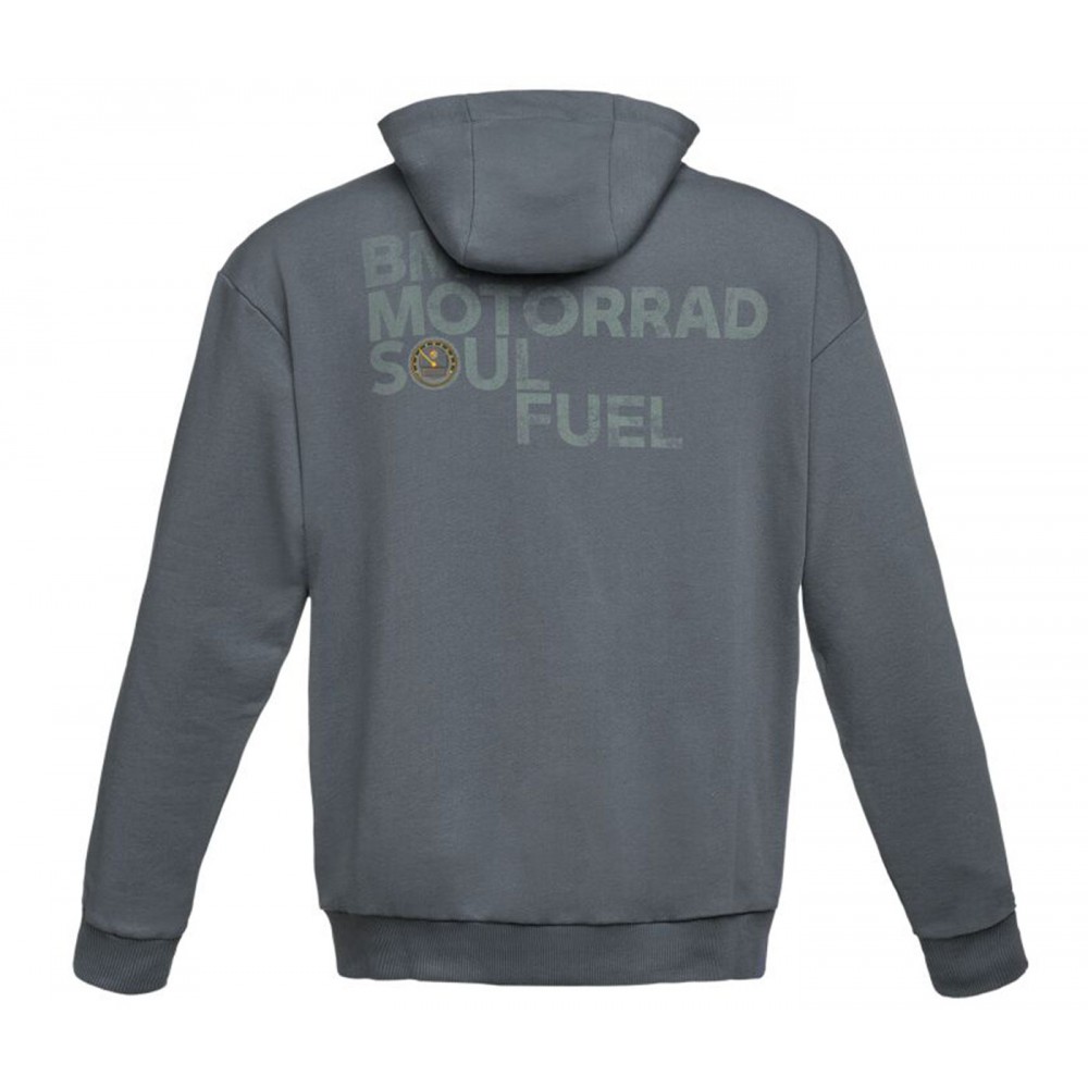 Classic cut hoodie pullover with zip fastener and large “BMW Motorrad Soulfuel” inscription across the upper back.