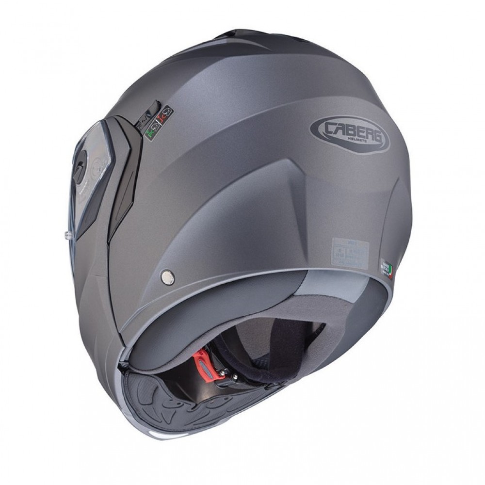 Το DUKE X είναι το αποτέλεσμα της αποκτηθείσας εμπειρίας της Caberg, η οποία ήταν η πρώτη ιταλική εταιρεία που παρήγαγε flip-up κράνη. Το DUKE X συνοδεύεται από διπλή πιστοποίηση P/J που σας επιτρέπει να οδηγείτε με ανοιχτό το προστατευτικό του πηγουνιού, εξασφαλίζοντας ασφάλεια χάρη στο μοχλό P/J στην αριστερή πλευρά του κράνους. Αυτός ο μοχλός, όταν βρίσκεται στη θέση "J", μπλοκάρει το προστατευτικό του πηγουνιού στην πλήρως ανοιχτή θέση, αποφεύγοντας να κλείσει κατά λάθος. Χάρη στις μειωμένες διαστάσεις του κράνους, το βάρος του DUKE X είναι μόνο 1550 gr +/- 50gr.