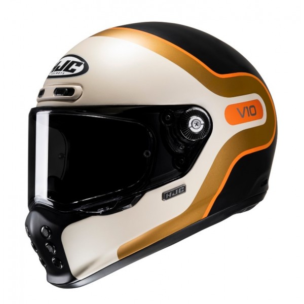 The V10 goes beyond the vintage look with new-age features such as a lightweight fiberglass shell, aerodynamic performance, emergency tabs for extra safety, detachable and washable interior, and easy bolts for a quick visor replacement. This helmet is Bluetooth compatible with Smart HJC.