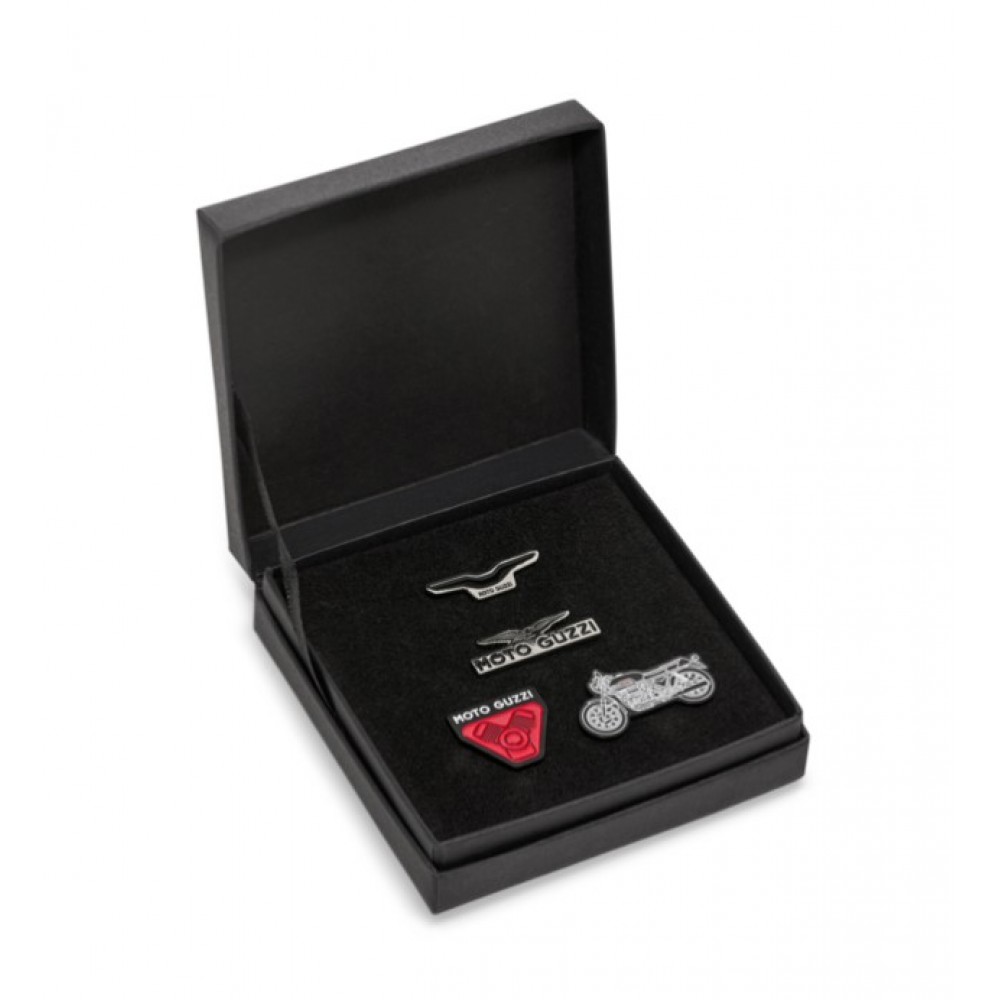 Σετ τεσσάρων ακίδων Moto Guzzi σε διάφορα σχήματα και μεγέθη από εμαγιέ μέταλλο. Μαύρο χάρτινο κουτί με λογότυπο Moto Guzzi σε απόχρωση. Ιδανικό ως δώρο για κάθε λάτρη της μάρκας.