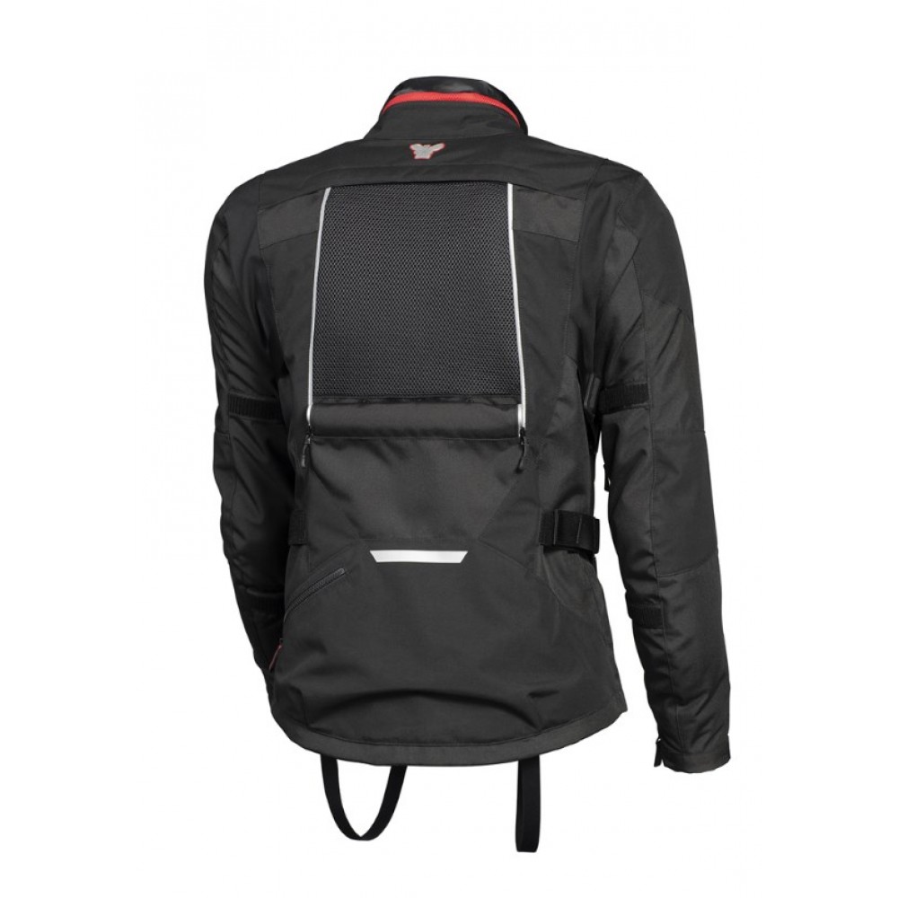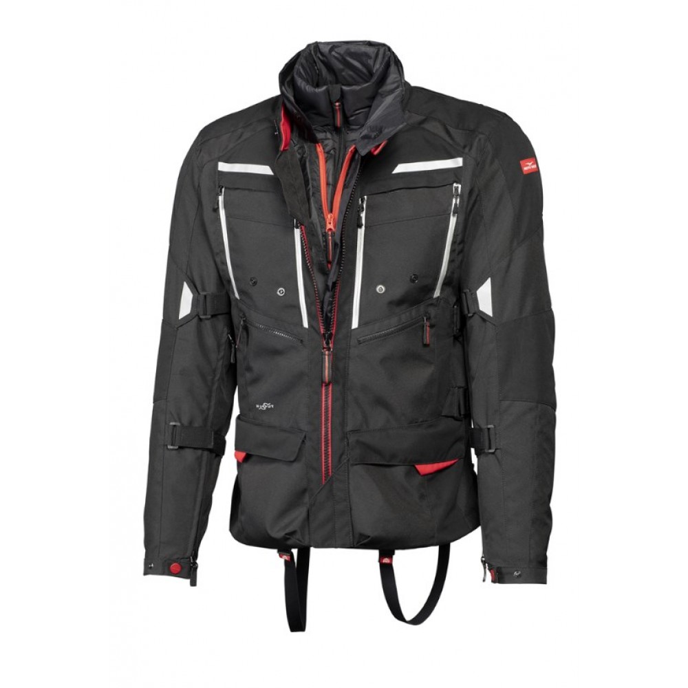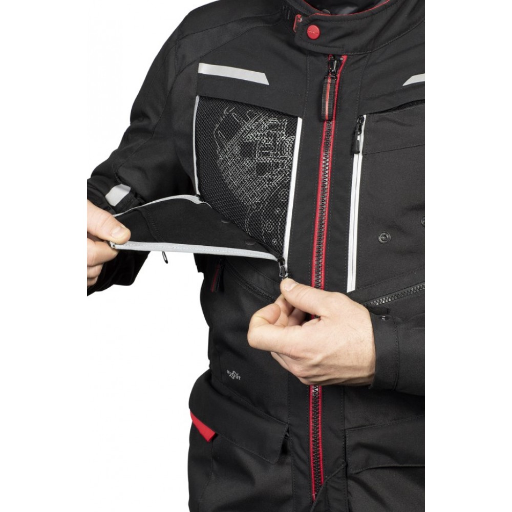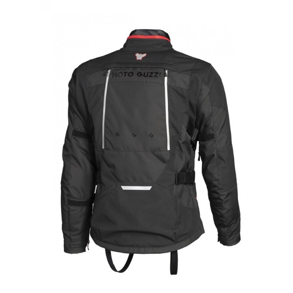 Μεγάλες 4 θήκες JKT, Adventure Touring εμπνευσμένες. Comfort Fit. Τεχνικό ύφασμα υψηλής αντοχής. Ρυθμιζόμενοι αεραγωγοί στο στήθος και τα μανίκια (μπροστινός αεραγωγός ως +). Αφαιρούμενη θερμική επένδυση. WP μεμβράνη (+ αφαιρούμενη και χρησιμοποιήσιμη μόνο). Ρυθμιζόμενη στερέωση μέσης & βραχιόνων, ρυθμιζόμενο σύστημα κολάρου. Προσαρμοσμένα κουμπιά Snap Moto Guzzi. Πιστοποιημένο πρότυπο EN 17092 (εγκεκριμένο). Προσαρμογείς CE 1621-1 με αγκώνες και ώμους. Διαρρύθμιση για (προαιρετικό) εσωτερικό προστατευτικό πλάτης CE (Lev 1 ή 2) (+ προστατευτικό στήθους). Συμβατό αερόσακος. 4 εξωτερικές τσέπες (1 wp). εσωτερικές τσέπες με επένδυση και μεμβράνη. Προσαρμογή μάρκας Moto Guzzi. Χρώματα: Μαύρο-Ασημί-Κόκκινο.