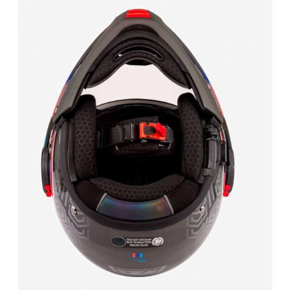 Το ξεχωριστό χαρακτηριστικό του Minimod Duo Meta είναι η διπλή ομολογκασιόν P/J, πιστοποιημένη σύμφωνα με το αυστηρό πρότυπο ασφαλείας ECE 22.06. Αυτή η κρίσιμη πιστοποίηση σημαίνει ότι μπορείτε νόμιμα και με ασφάλεια να οδηγείτε με το προστατευτικό σαγόνι είτε στην κλειστή (P - Protective) είτε στην ανοιχτή (J - Jet) θέση, προσφέροντας πραγματική λειτουργικότητα δύο σε ένα. Ο μηχανισμός του προστατευτικού σαγονιού είναι σχεδιασμένος για αβίαστη λειτουργία με το ένα χέρι, επιτρέποντάς σας να αλλάζετε λειτουργίες γρήγορα και με ασφάλεια, ακόμη και όταν φοράτε γάντια.