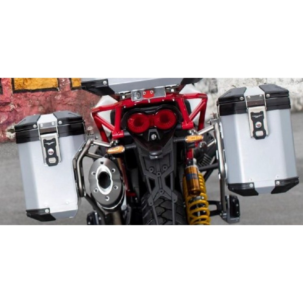 Πλαϊνές βαλίτσες αλουμινίου πάχους 1,5 mm υψηλής αντοχής, ευρύχωρες, (αριστερή 33 lt, δεξιά 38 lt) βαμμένες με ηλεκτροτατική βαφή, για μεγαλύπερη προστασία και διάρκεια.