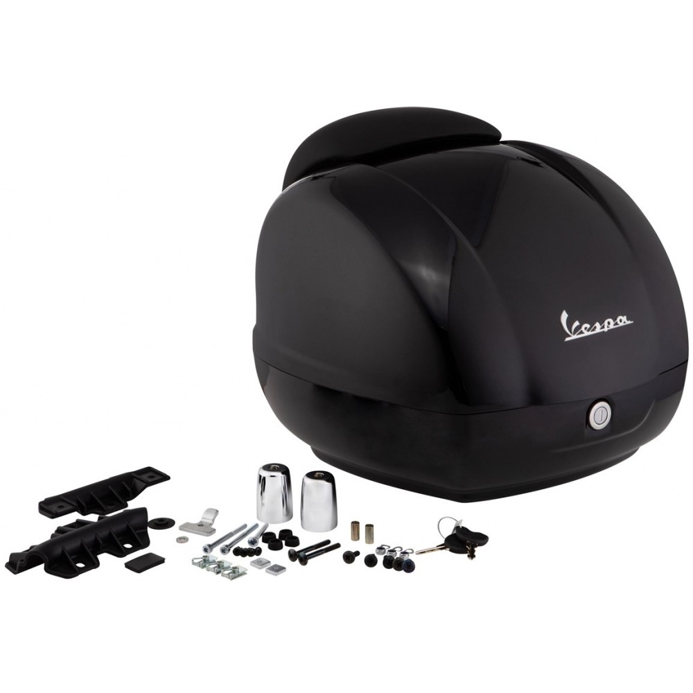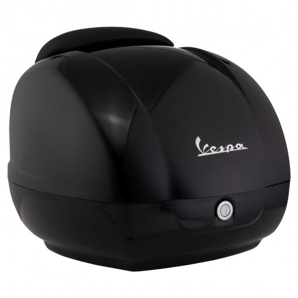 Βαμμένη κορυφαία θήκη, με κάλυμμα πλάτης που καλύπτεται με το ίδιο υλικό και τελειώνει με τη σέλα. Φρέσκο, μοντέρνο σχεδιασμό που συμπληρώνει τις απαλές, ρέουσες φόρμες της Vespa. Μπορεί να κρατήσει ένα κράνος full face ή δύο κράνη τζετ. Στηρίγματα πλάτης, κιτ στερέωσης, μικρά βάρη τερματικού και βαρούλκου. Η σχαρα δεν περιλαμβάνεται.