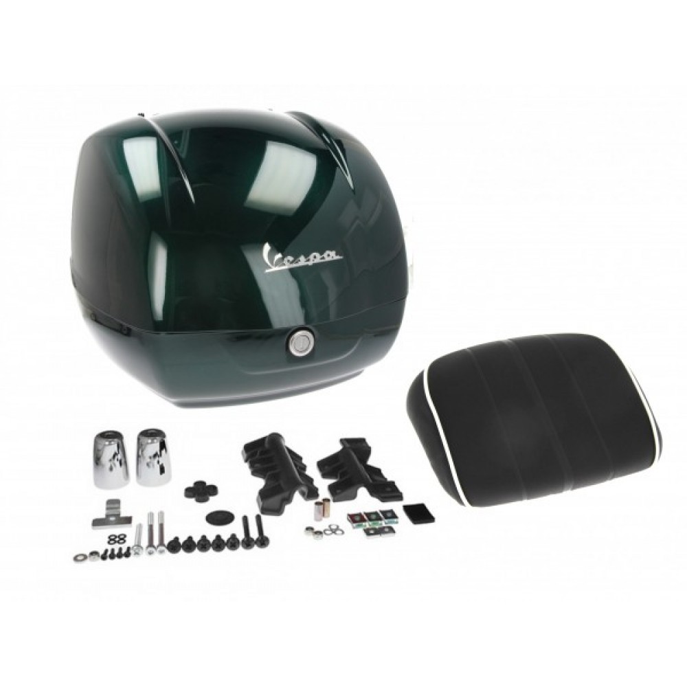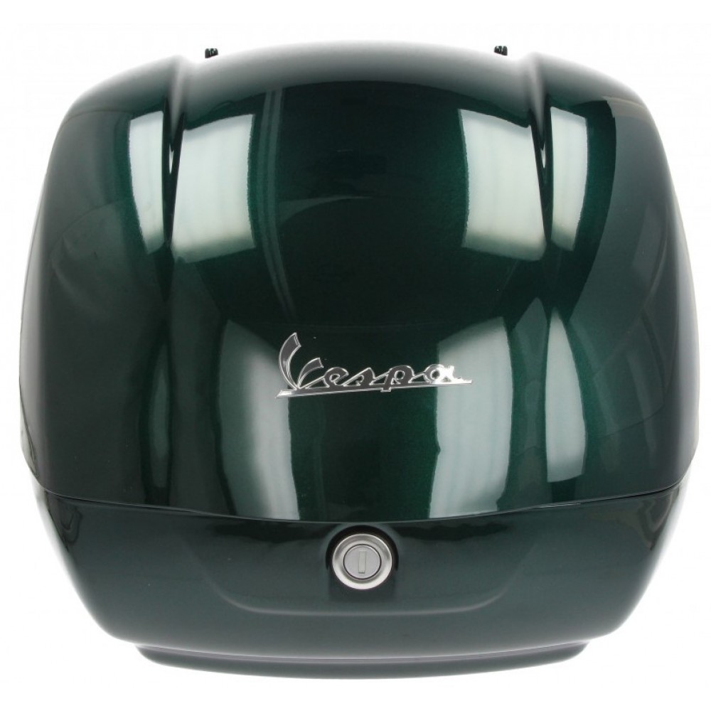 Βαμμένη κορυφαία θήκη, με κάλυμμα πλάτης που καλύπτεται με το ίδιο υλικό και τελειώνει με τη σέλα. Φρέσκο, μοντέρνο σχεδιασμό που συμπληρώνει τις απαλές, ρέουσες φόρμες της Vespa. Μπορεί να κρατήσει ένα κράνος full face ή δύο κράνη τζετ. Στηρίγματα πλάτης, κιτ στερέωσης, μικρά βάρη τερματικού και βαρούλκου. Η σχαρα δεν περιλαμβάνεται.