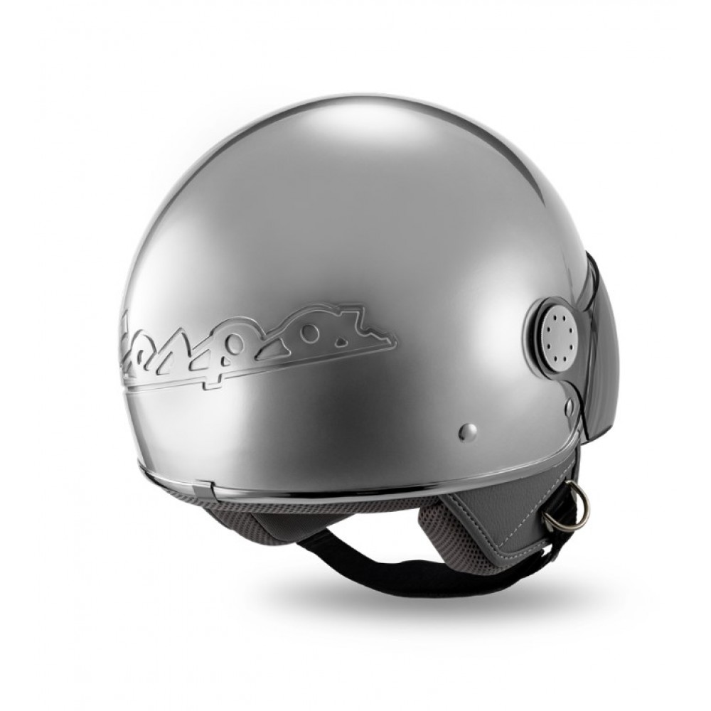 Κράνος demi-jet κατασκευασμένο από υλικό ABS με φινίρισμα από οικολογικό δέρμα στο κέλυφος. Ειδική ζελατίνα Fumè 2 mm με αντιχαρακτική επεξεργασία και αγκράφες αλουμινίου. Χαραγμένο λογότυπο Vespa στο πίσω κέλυφος. Μικρομετρικό σύστημα συγκράτησης με αντικλεπτικό δακτύλιο. Καινοτόμο αναπνεύσιμο εσωτερικό από τρισδιάστατο ύφασμα. Εσωτερική επένδυση: πλενόμενη, αφαιρούμενη και προσαρμοσμένο λογότυπο Vespa. Πιστοποίηση ECE 22.06. Κατασκευασμένο στην ΙΤΑΛΙΑ.