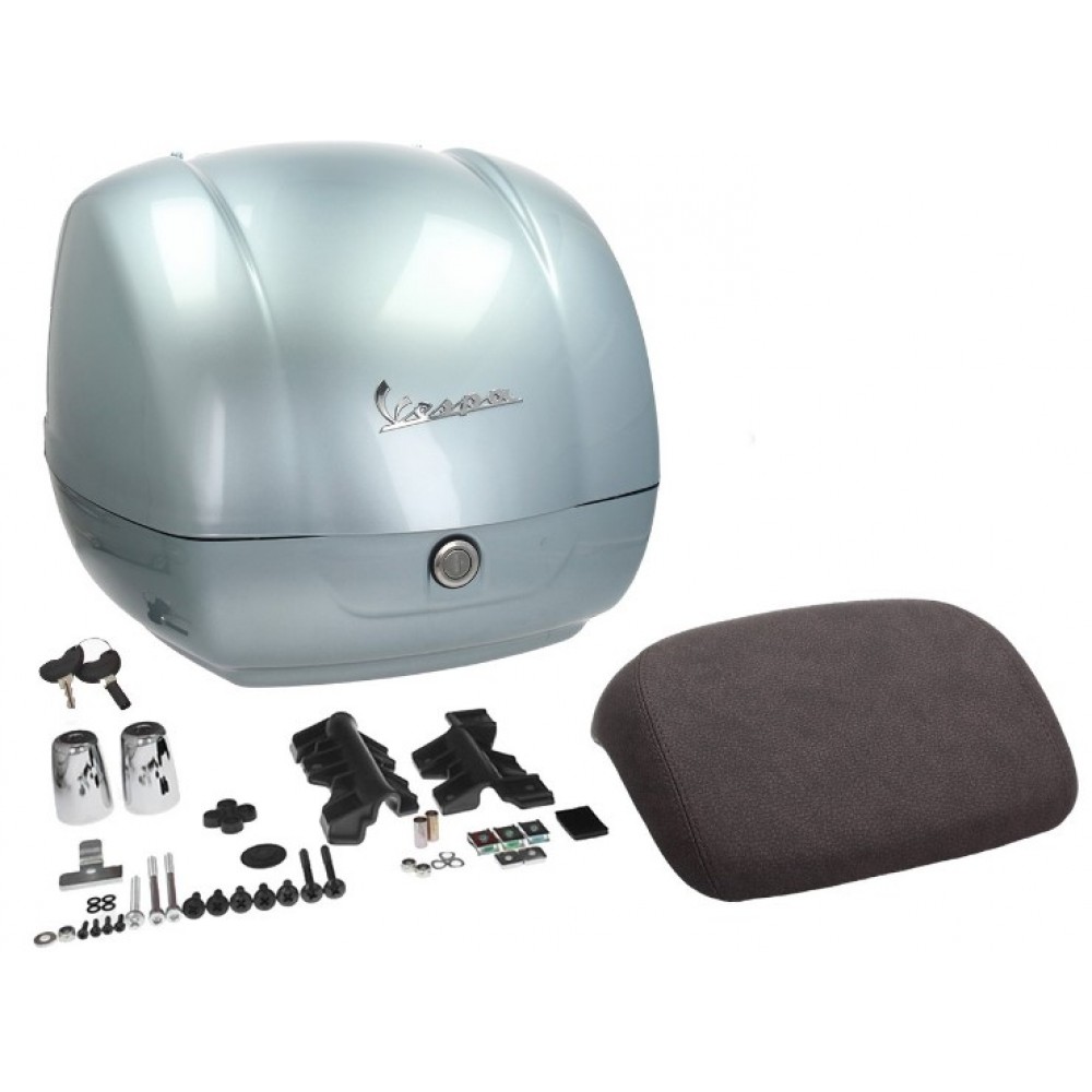 Βαμμένη κορυφαία θήκη, με κάλυμμα πλάτης που καλύπτεται με το ίδιο υλικό και τελειώνει με τη σέλα. Φρέσκο, μοντέρνο σχεδιασμό που συμπληρώνει τις απαλές, ρέουσες φόρμες της Vespa. Μπορεί να κρατήσει ένα κράνος full face ή δύο κράνη τζετ. Στηρίγματα πλάτης, κιτ στερέωσης, μικρά βάρη τερματικού και βαρούλκου. Η σχαρα δεν περιλαμβάνεται.Πλάτη βαλίτσας CM273229 περιλαμβάνεται στον κωδικό.