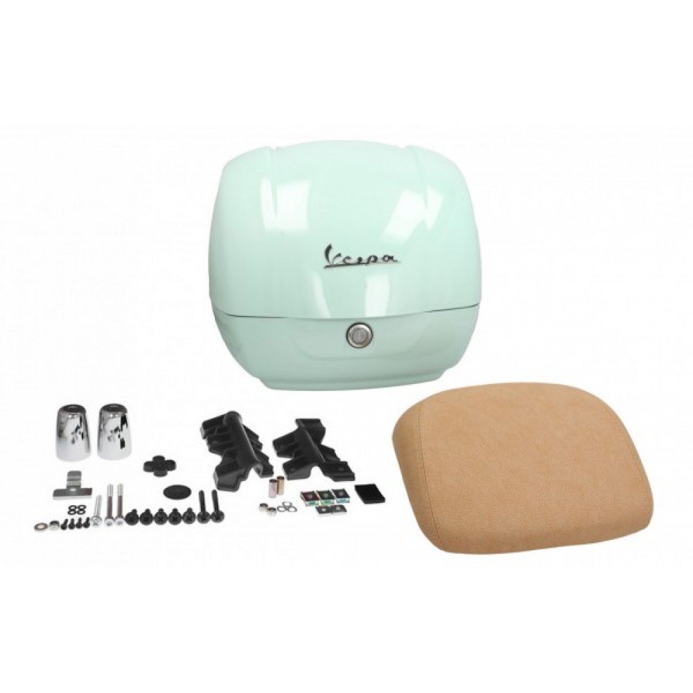Βαμμένη κορυφαία θήκη, με κάλυμμα πλάτης που καλύπτεται με το ίδιο υλικό και τελειώνει με τη σέλα. Φρέσκο, μοντέρνο σχεδιασμό που συμπληρώνει τις απαλές, ρέουσες φόρμες της Vespa. Μπορεί να κρατήσει ένα κράνος full face ή δύο κράνη τζετ. Στηρίγματα πλάτης, κιτ στερέωσης, μικρά βάρη τερματικού και βαρούλκου. Η σχαρα δεν περιλαμβάνεται.